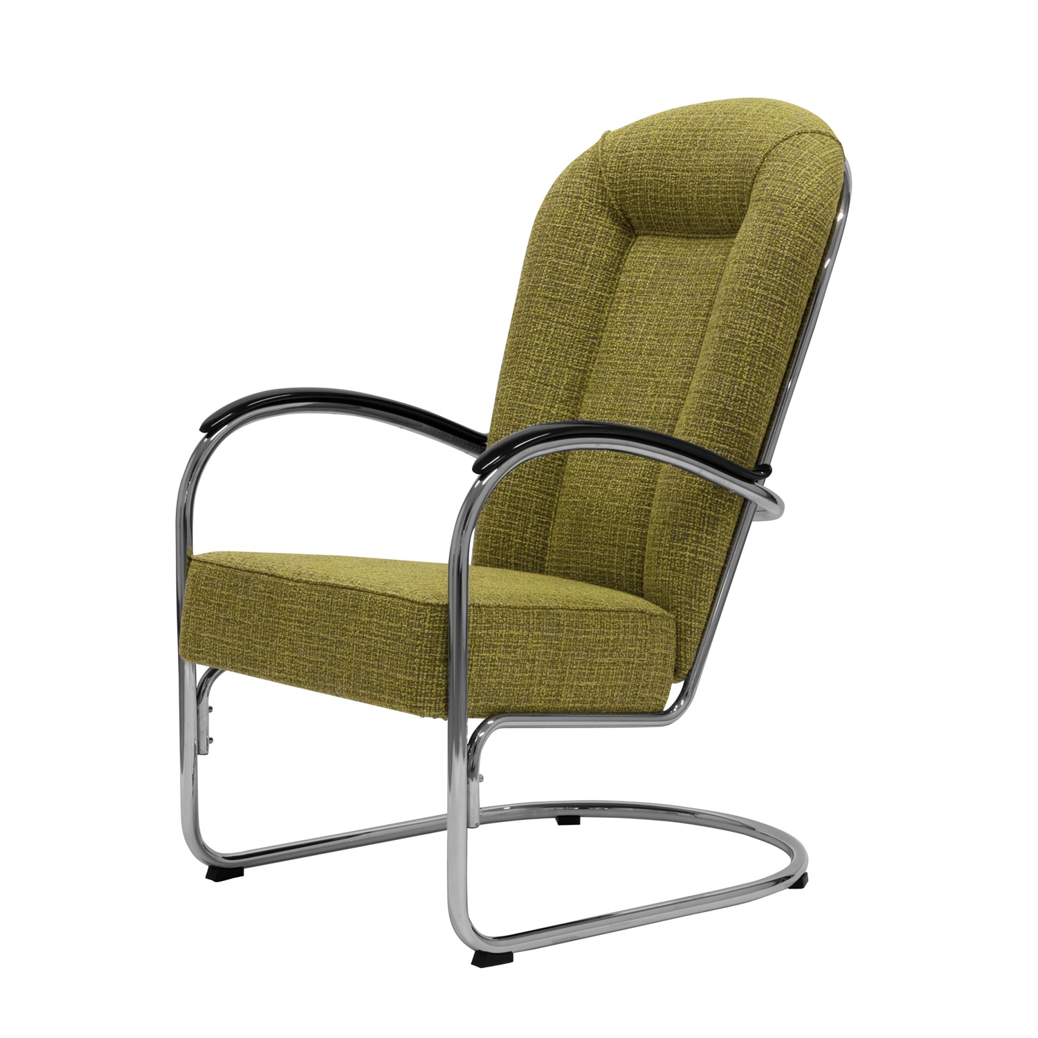 De Gispen AA fauteuil is een icoon binnen het Nederlandse design. Het slanke stalen buisframe – leverbaar in hoogglans chroom of mat zwart poedercoat – geeft de stoel zijn herkenbare, moderne uitstraling. De klassieke zwarte bakelieten armleggers zijn standaard, maar kunnen ook worden uitgevoerd in beuken blank gelakt of beuken zwart gelakt voor een warmere uitstraling.