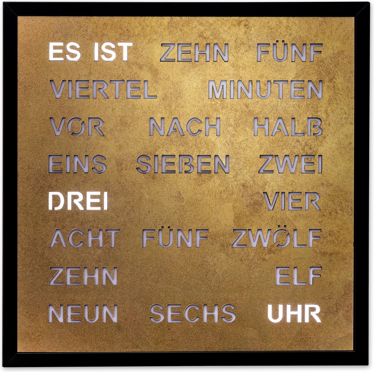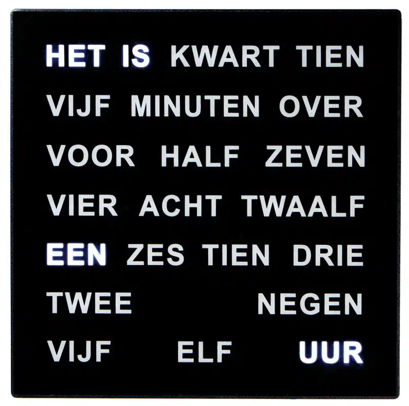 De Intertime woordklok is een stijlvolle, Nederlandstalige designklok die de tijd weergeeft in woorden. De subtiele witte LED-verlichting laat precies die woorden oplichten die het actuele tijdstip vormen – een moderne, rustgevende manier om de tijd af te lezen. De klok heeft een elegante zwarte behuizing met een acrylglazen wijzerplaat en kan zowel staand als hangend worden gebruikt.